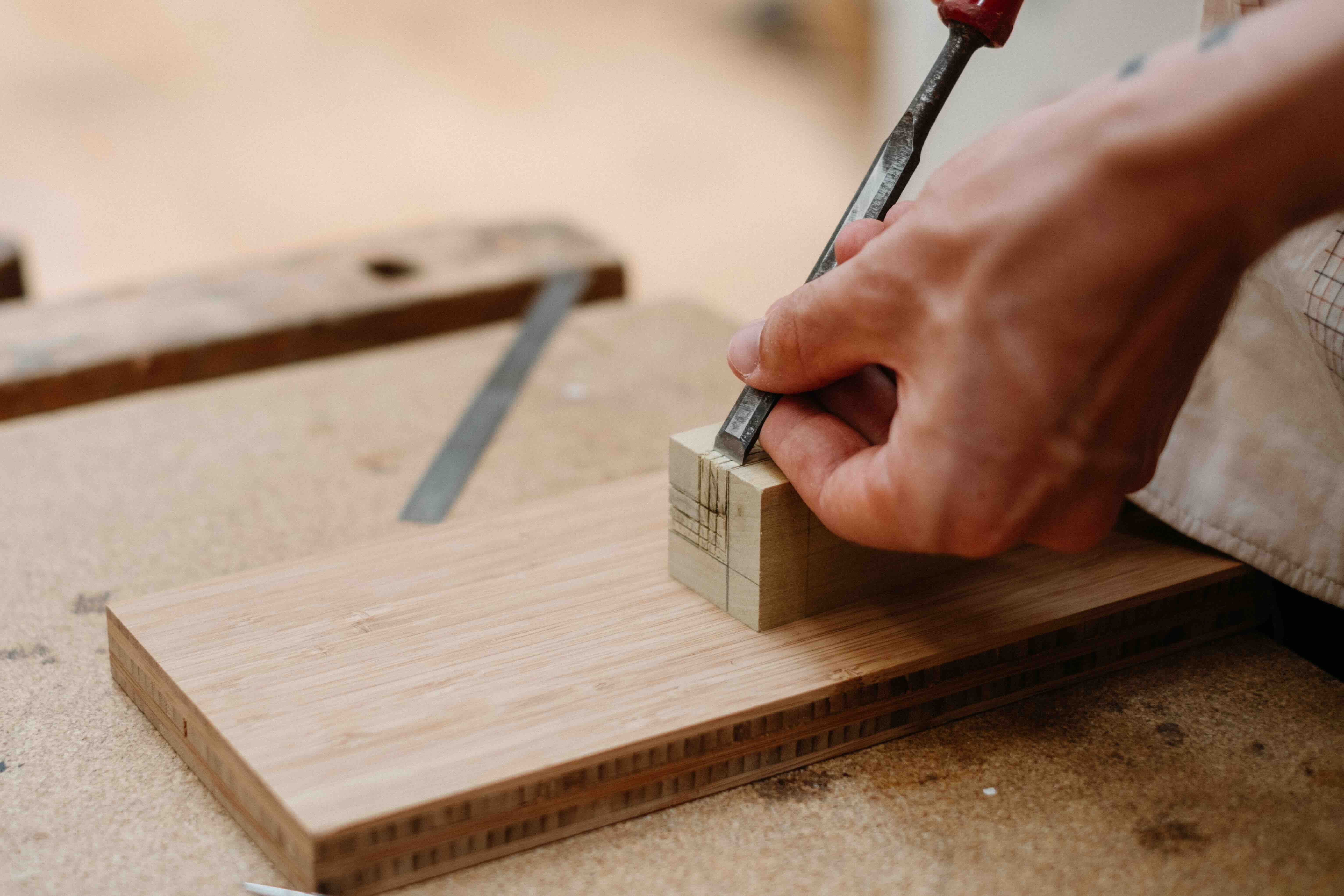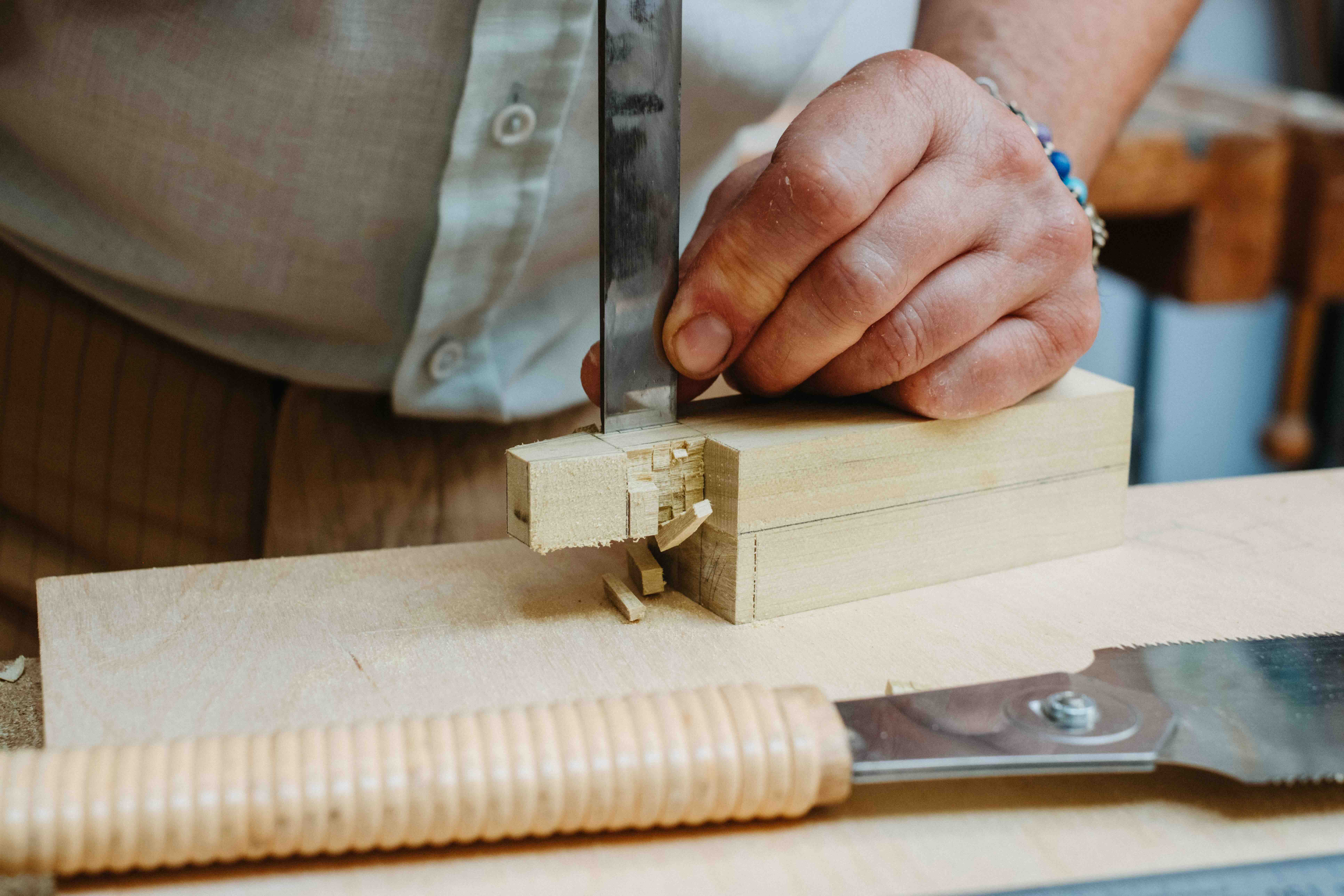Met handgereedschap maken we houten verbindingen. We verbinden verschillende stukken hout zonder lijm of schroeven te gebruiken. Deze methode is geïnspireerd op eeuwenoude Japanse en europese houtverbindingstechnieken.